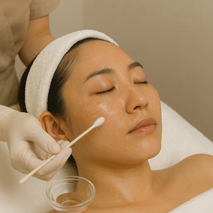 Thực hiện peel da: Thoa dung dịch chuyên dụng peel (AHA, BHA, TCA…) dưới sự kiểm soát của chuyên gia.